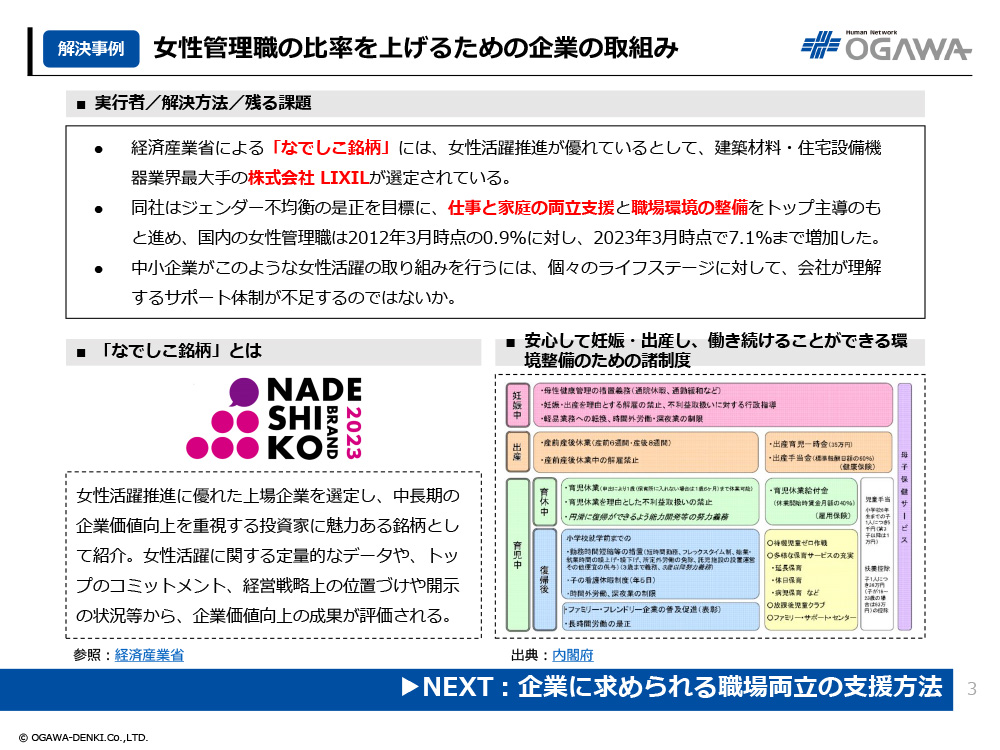 - 経済産業省による「なでしこ銘柄」には、女性活躍推進が優れているとして、建築材料・住宅設備機器業界最大手の株式会社 LIXILが選定されている。