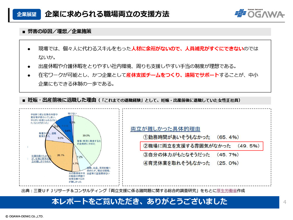 - 在宅ワークが可能とし、かつ企業として産休支援チームをつくり、遠隔でサポートすることが、中小企業にもできる体制の一歩である。