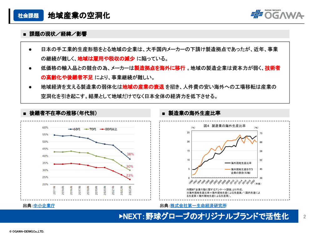 - 低価格の輸入品との競合の為、メーカーは製造拠点を海外に移行。地域の製造企業は資本力が弱く、技術者の高齢化や後継者不足により、事業継続が難しい。