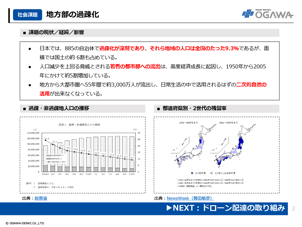 - 日本では、885の自治体で過疎化が深刻であり、それら地域の人口は全国のたった9.3%であるが、面積では国土の約 6割も占めている。