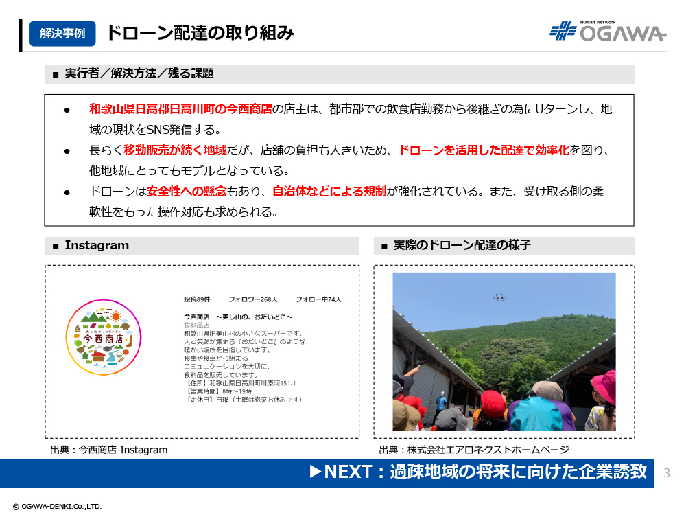 - 長らく移動販売が続く地域だが、店舗の負担も大きいため、ドローンを活用した配達で効率化を図り、他地域にとってもモデルとなっている。