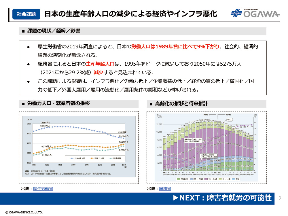 - 厚生労働省の2019年調査によると、日本の労働人口は1989年台に比べて9%下がり、社会的、経済的課題の深刻化が懸念される。