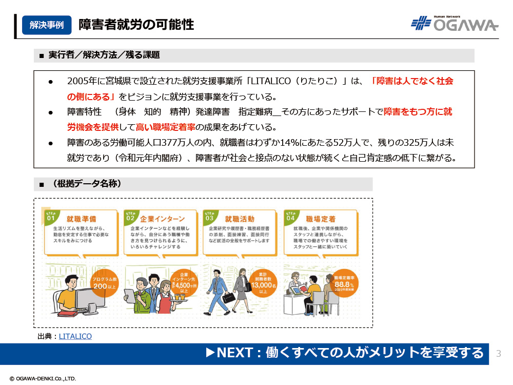 - 2005年に宮城県で設立された就労支援事業所「LITALICO(りたりこ)」は、「障害は人でなく社会の側にある」をビジョンに就労支援事業を行っている。