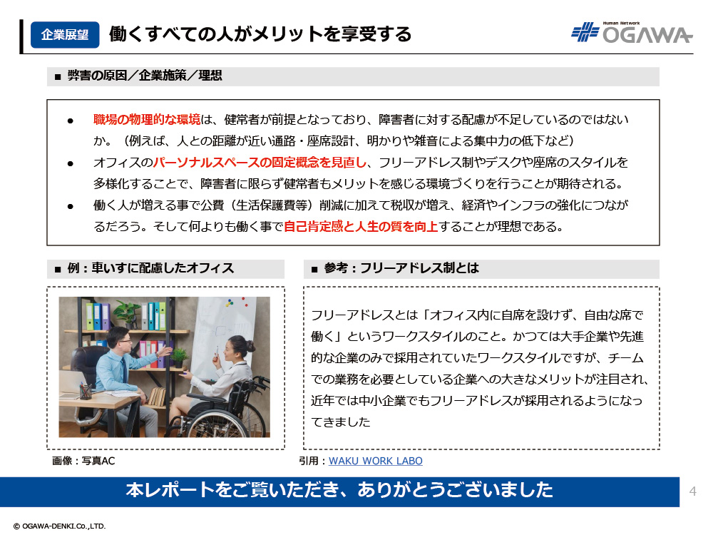 - オフィスのパーソナルスペースの固定概念を見直し、フリーアドレス制やデスクや座席のスタイルを多様化することで、障害者に限らず健常者もメリットを感じる環境づくりを行うことが期待される。