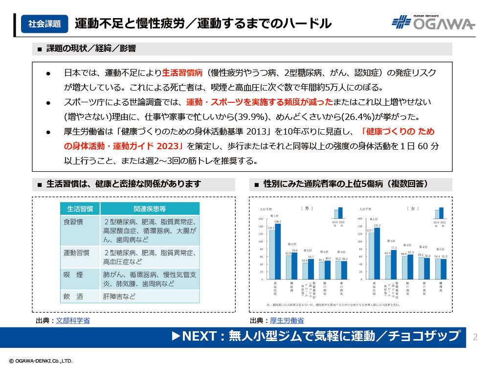 - 日本では、運動不足により生活習慣病(慢性疲労やうつ病、2型糖尿病、がん、認知症)の発症リスクが増大している。これによる死亡者は、喫煙と高血圧に次ぐ数で年間約5万人にのぼる。