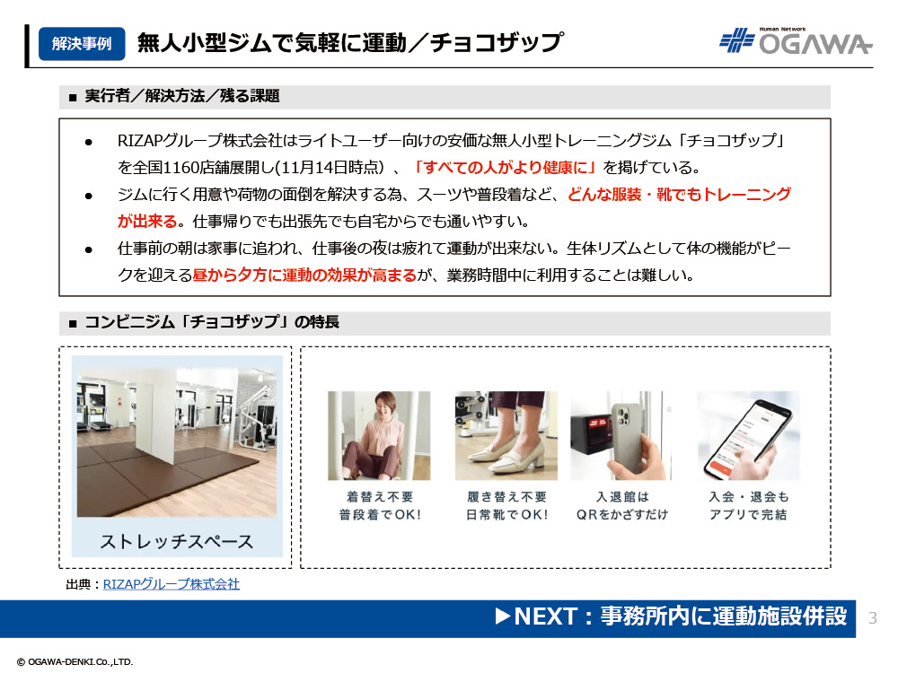 - RIZAPグループ株式会社はライトユーザー向けの安価な無人小型トレーニングジム「チョコザップ」を全国1160店舗展開し(11月14日時点)、「すべての人がより健康に」を掲げている。