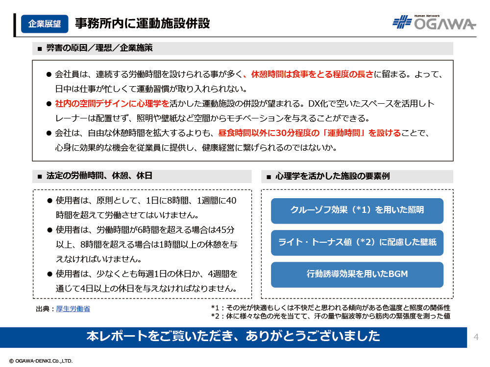 - 社内の空間デザインに心理学を活かした運動施設の併設が望まれる。DX化で空いたスペースを活用しトレーナーは配置せず、照明や壁紙など空間からモチベーションを与えることができる。
