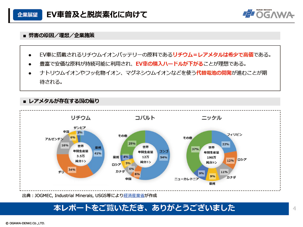 - 豊富で安価な原料が持続可能に利用され、EV車の購入ハードルが下がることが理想である。