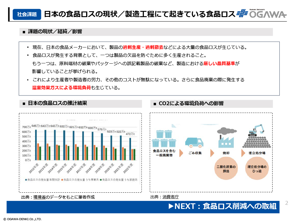 - 現在、日本の食品メーカーにおいて、製品の過剰生産・過剰撤去などによる大量の食品ロスが生じている。