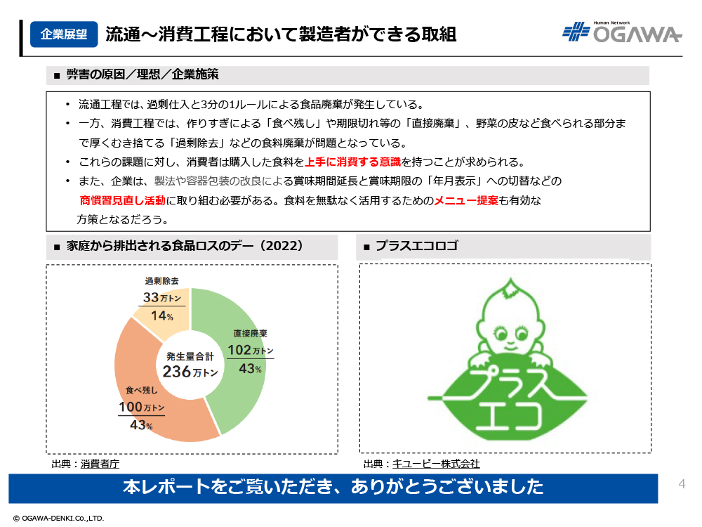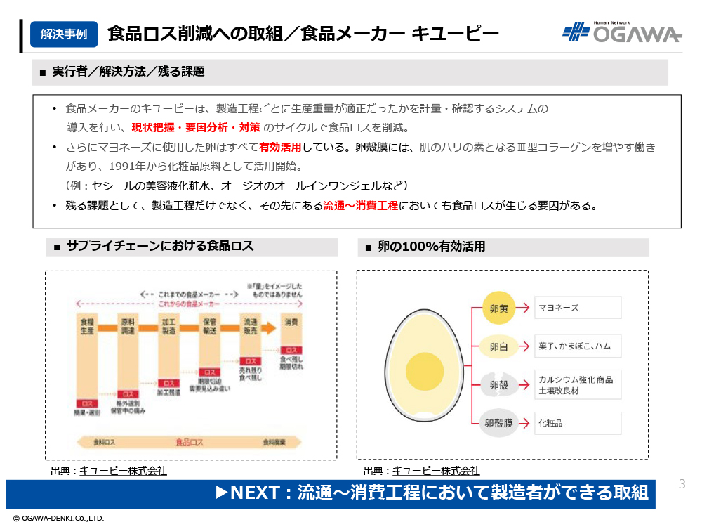 - 食品メーカーのキユーピーは、製造工程ごとに生産重量が適正だったかを計量・確認するシステムの導入を行い、現状把握・要因分析・対策のサイクルで食品ロスを削減。