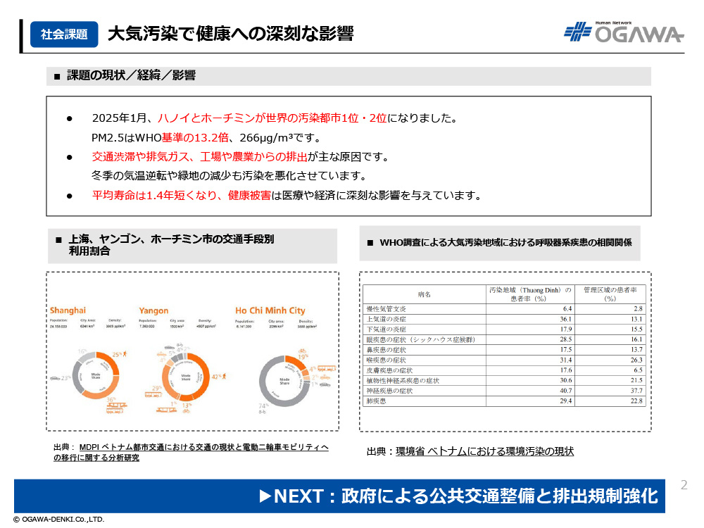 - ベトナム政府は公共交通の整備や排出規制を強化し、企業は電動車など環境技術を 提供しています。市民も日常の行動で協力するのは必要があります。