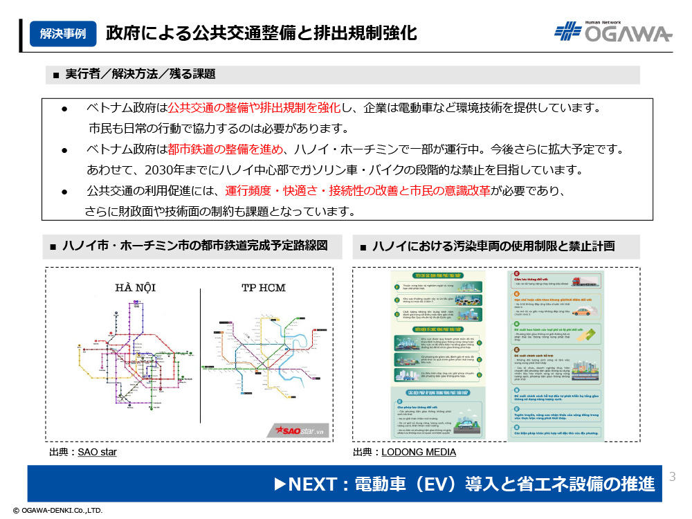- ベトナム政府は都市鉄道の整備を進め、ハノイ・ホーチミンで一部が運行中。今後さらに拡大予定です。あわせて2030年までにハノイ中心部でガソリン車・バイクの段階的な禁止を目指しています。