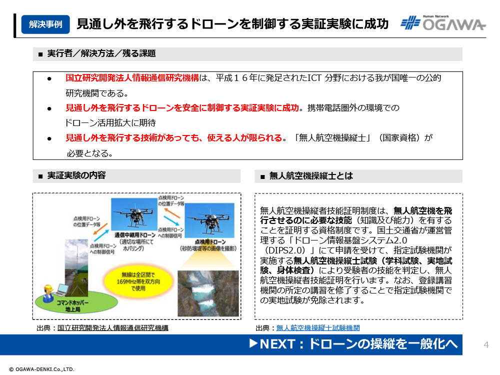 - 見通し外を飛行する技術があっても、使える人が限られる。「無人航空機操縦士」(国家資格)が必要となる。