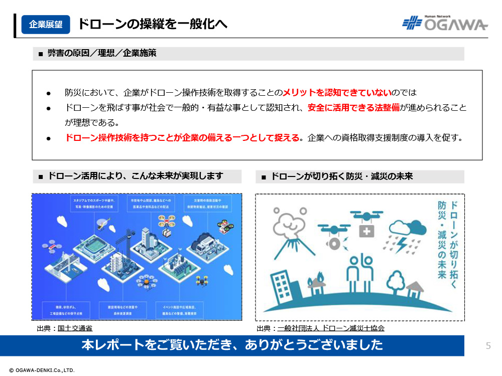 - ドローン操作技術を持つことが企業の備える一つとして捉える。企業への資格取得支援制度の導入を促す