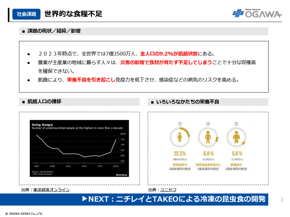 - 2023年時点で、全世界では7億3500万人、全人口の9.2%が飢餓状態にある。