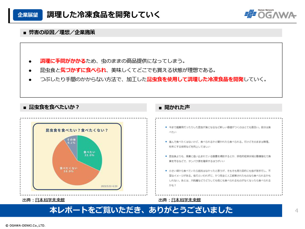 - つぶしたり手間のかからない方法で、加工した昆虫食を使用して調理した冷凍食品を開発していく。